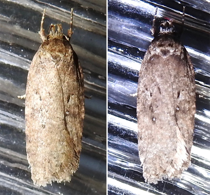 Night-flying moth ca. 10 mm in length; body elongate-ovate; flattened at rest with one forewing strongly overlapping the other; wings pale khaki; with a pair of small black marks towards the front and a pair of silver dashes mid-length; rear of wings without strong ribs. Identity likely but not certain without microscopic investigation.