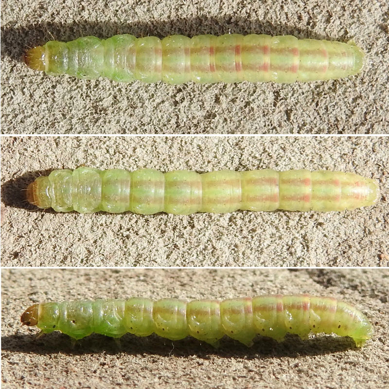 Small green hairless caterpillar with red dorso-lateral bands; head reddish brown. For adult see Common rustic