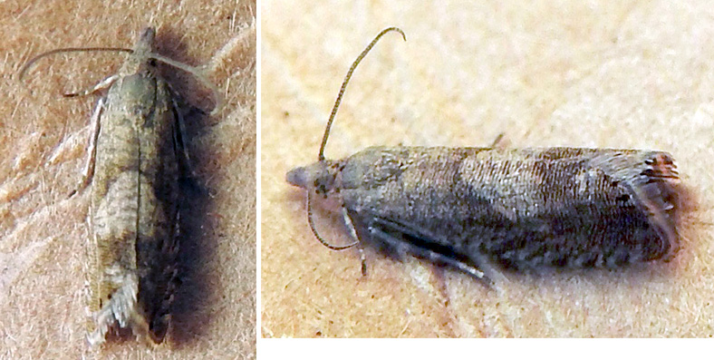 Small moth with mottled beige wings and a broad, sharply-defined off-white, streaked triangular blotch on its back. In light trap 24th June, 2024. In light trap 20th (1) and 29th (1) June, 2025.