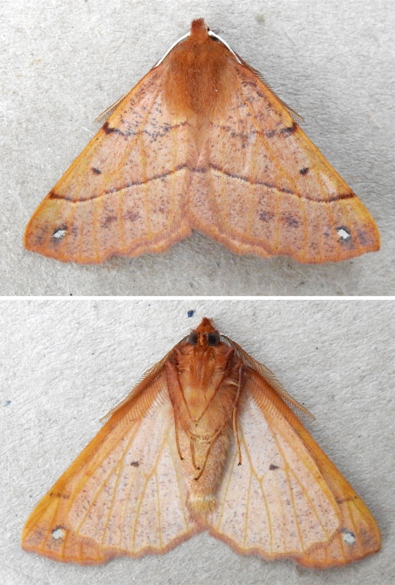 Night-flying orange-brown geometrid with two transverse dark line and two pairs of black spots.