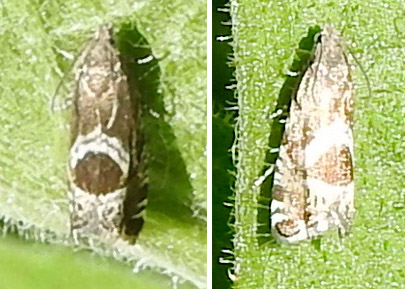 Small day-flying tortrix moth with dark brown body marked with a double white crescent on the dorsum and white patches towards wing tip. Flying in wild flower border 14th May, 2025.