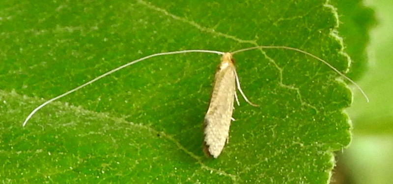 Body length ca. 10 mm (grass leaf breadth = 7.1 mm). Ochre-coloured, faintly speckled moth with antennae at least twice as long as body. Wings upright at rest with well-defined forewing apex; fringed ends to wings. Head with long orange-yellow tuft of hairs. Seen during the day in undergrowth beneath the cut-leaf beech and (2025) by russet apple tree.