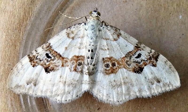 Night-flying moth with white wings crossed by a brown-black band mid-length and with a grey posterior border. Identity confirmed by Malcolm Lindsay (Roxburghshire regional moth recorder).