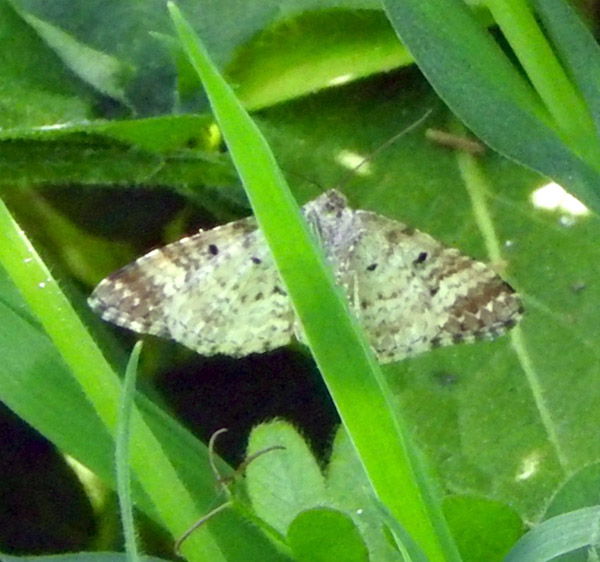 Day-flying geometrid moth with several cross-bands and a prominent slightly elongate black spot on each wing; wing border a checked pattern of dark and light bands. Identification tentative as only lower surface seen.