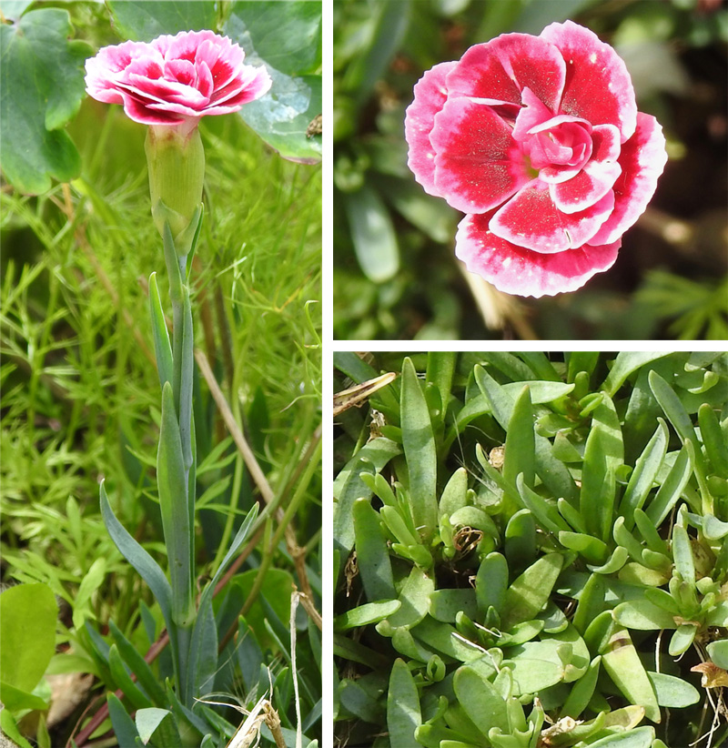 A small, compact perennial with dense narrow grey-green leaves that clasp the flower stem at their base. Flowers open and in 2-3 cycles; red with white edges.