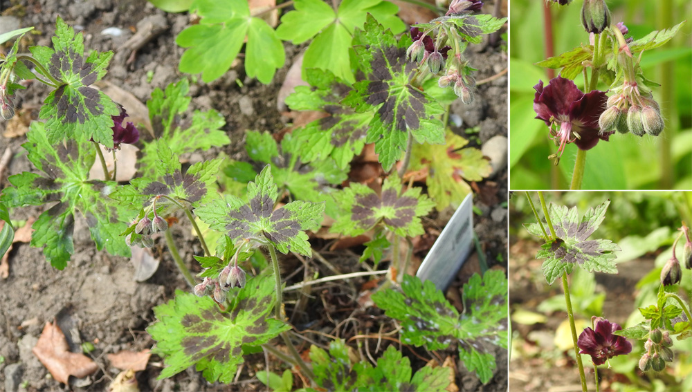 A perennial geranium with rounded, deeply lobed leaves with blotchy red-brown cetres. Flowers pendulous, in clusters; maroon in colour.