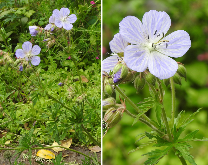 A perennial geranium with deeply lobed green leaves, and open, five-petaled, white-veined lilac flowers.