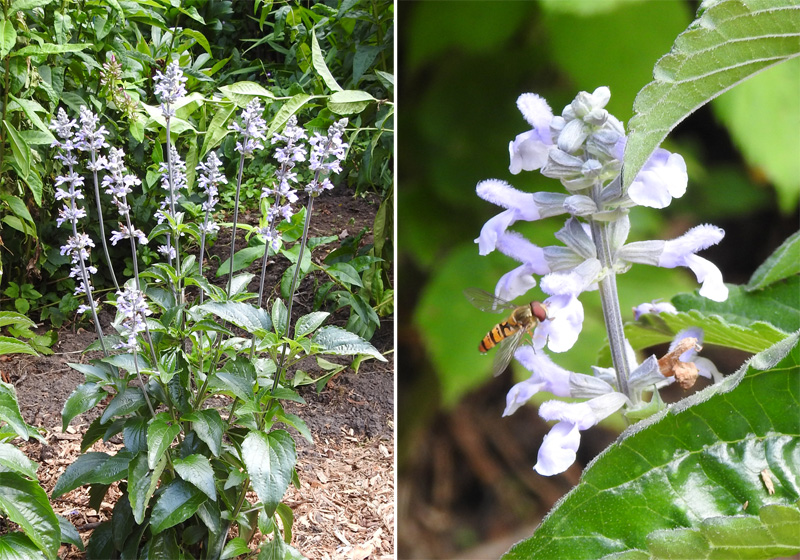 Medium-sized perennial with wrinkled green ovate leaves in opposite pairs, and tall spikes of violet-blue tubular bilateral flowers.