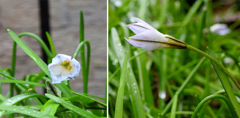 Small perennial with strap-like leaves and stalks with a single tubular white flower with strong median green-brown stripe along outside of petals.