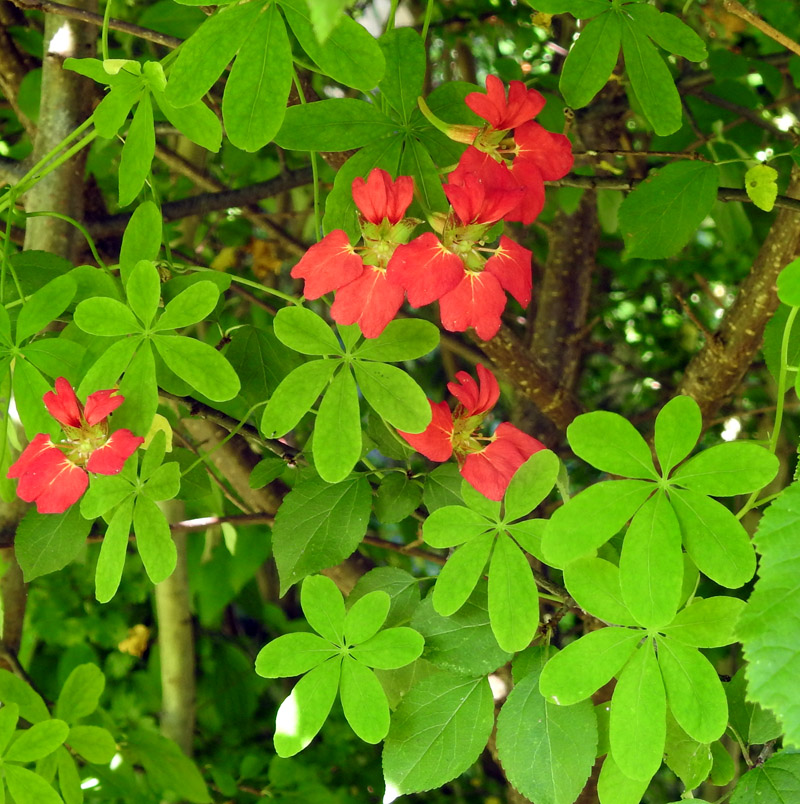 Climbing slender plant with 6-7 lobed leaves and loose, scarlet 5-petalled flowers.