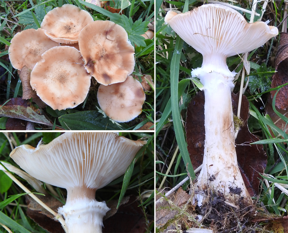 Large fungus up to 12 cm diameter. Cap initially rather pink in hue with paler edges and domed; covered with fine darker flecks - denser towards the centre - giving it a stubbly appearance; turning rusty orange with age and becoming funnel-shaped; no umbo; fine striations around the edge of mature cap. Gills off-white, becoming dark rusty brown with age; fine fragments of velar on gill and cap edge when young. Stem expanding downwards to a bulbous base that shows minor yellow staining; fibrous; reddish-brown below persistent upward turned ragged collar; paler above collar; turning almost black with age. Individual or as a dense cluster of individuals.