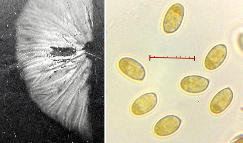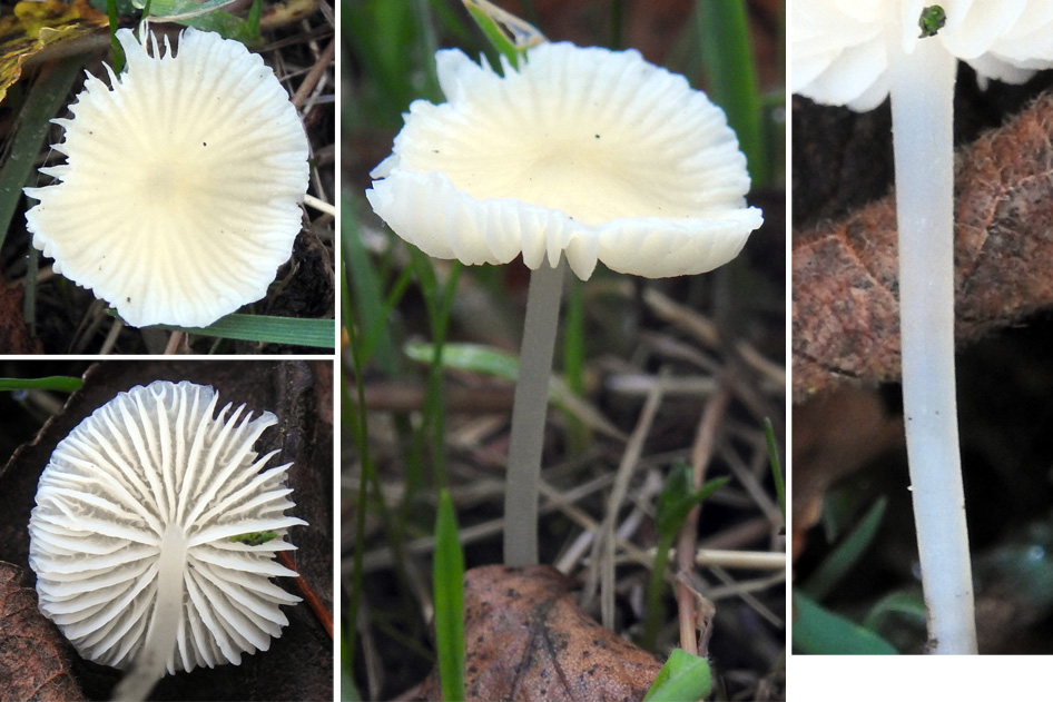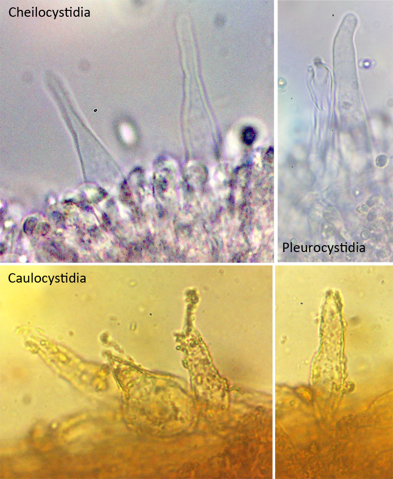 Very small fungus mostly less 1 cm diameter. Cap conical to bell-shaped; cream to off-white in colour with darker apex and paler margin; distinct radial banding evident around outer part. Gills adnexed and emarginate; white in colour. Stalk slender, hollow, pale and translucent; covered in fine 'hairs'. Spore print white; no amyloid reaction. Spores simple, smooth, thin-walled with small apiculus; 6.2-7.1 x 3.7-4.0 um, mean = 6.4 x 3.8x, N = 20; Qav = 1.7. Cheilocystidia common, lageniform to fusiform. Pleurocystidia sparse, lageniformn. Caulocystidia lageniform to spherical (forming fine white fuzz on the stype).