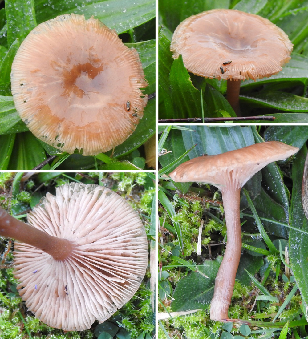 Cap to 4 cm in diameter; hygrophanous, bi-tone in colour translucent with striae around the rim, orange brown when wet, drying to creamy white across most of the disc, with a darker browm central 'eye'; low domed, almost flat, edge not inturned. Gills adnate, pale; unbranched; dense. Stalk 45 mm x 5 mm; white hyphae at base; no ring; hollow. Spore print creamy white; no amyloid reaction. Spores ovate with smooth surface; 6.7-8.1 x 3.8-4.2 um mean = 7.3 x 4.0 um N = 20; Qav. = 1.8. No cystidia.