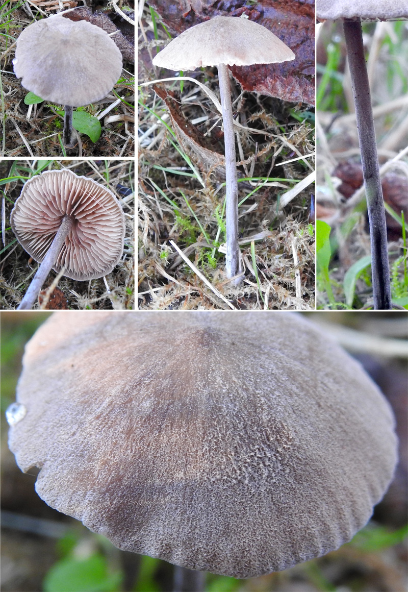 Small dark Entoloma with small, sharply defined umbo and very thin and stiff stem. Cap 23x25 mm in diameter; smooth and dry; dark brown in colour with an almost black central umbo and obvious radial striae over outer part; umbo distinctly pointed and rim of cap turned down and slightly crenulated. Another specimen with a frosted, felty surface. Gills pinkish white in colour; emarginate to adnexed; gill edges frayed under magnification. Stem dark with lilac tinge, very stiff but very slender; 50 x 2 mm; pruinose with well-developed white hyphal mat at base.