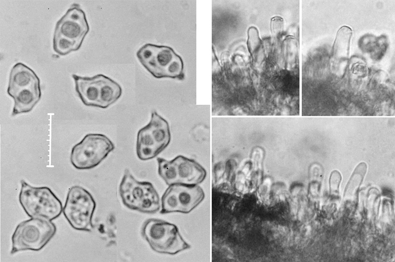 Spore print dull orange. Spores angular with pointed apiculus; thick-walled; longer than wide; 8.2-10.0 x 5.2-6.5 um, mean = 9.3 x 6.1 um, N = 17; Q = 1.5. Cheilocystidia common, more or less cylindrical and sometimes with a separate cap. Caulocystidia present at top of stem.