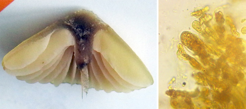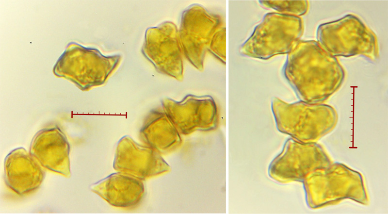 Small olive green-yellow mushroom; cap 15 mm in diameter; conical with pointed dark apex and yellow-olive radially banded margin. Gills adnate to weakly emarginate, cream coloured, rather coarse. Stem brownish-olive to 60 mm in length and slender (2 mm); rather stiff; no ring, no basal hyphae. Spore print rosy. Spores amyloid; angular and with strong pointed apiculus; 9.8-12.0 x 6.5-8.7 um (mean = 10.4 x 7.2 um, N = 14). Qav = 1.45. Rare clavate cheilocystidia but mostly absent.