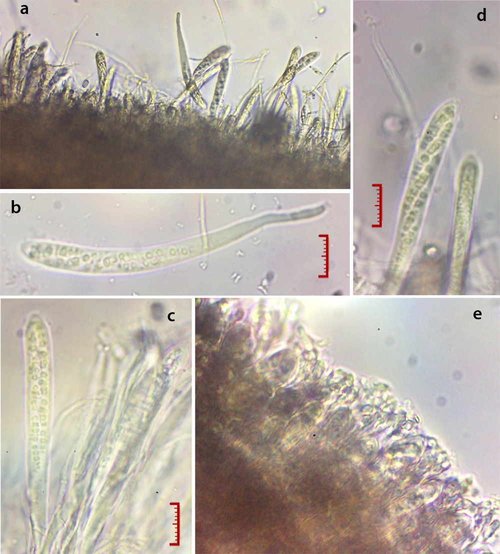Tiny pale, stemmed inoperculate cup fungus up to 2.5 mm in diameter and standing ca. 2-3 mm above the substrate on a thin stalk. Cup inner surface cream, yellow or peach, without rim, but white on lower/outer surface. Ascii (a-d) with 1- or 2-celled spores arranged spirally; no crozier. Outer surface (section e) composed of clavate cells. Spores 18-22 x 3-4 um (mean = 20 x 3.7 um, N= 6); elongate and pointed at one end, rounded at the other; 1-2 celled; full of oil droplets.
