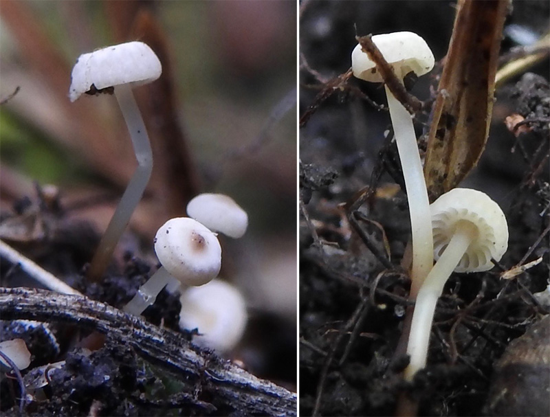 Desiccated and wrinkled when first found, but cap revitalised after moistening. Cap to 20 mm in diameter; white, domed with slightly inturned edge and depressed centre; radial grooves well developed towards the outside so that the outer part of the disc has a quilted appearance. Gills pale flesh colour; all gills simple and reaching the stem where they fuse together to form a collarium that encircles the stem; no sign of secondary gills even in the largest specimen; adnate. Stalk black and twisted; fibrous – very tough; thin >2 mm in diameter and up to 4 cm long. Spore print white. Spores elongate pip-like with one end projecting as a point; 8.3-9.9 x 3.2-4.3 um (mean = 9.0 x 3.6 um, n = 24). Cheilocystidea sparse, bulbous or fingered.
