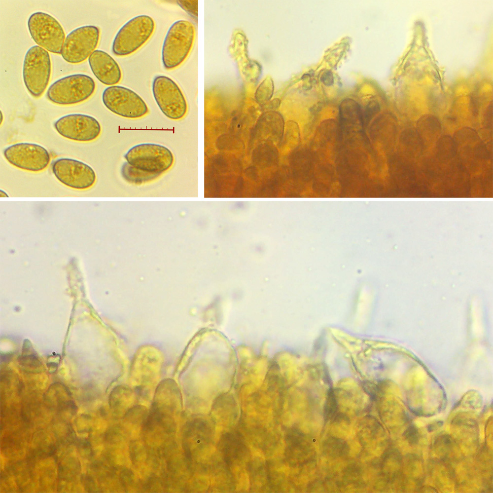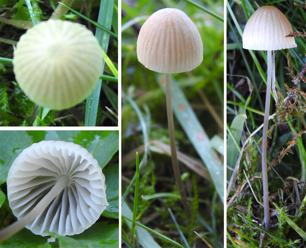 Small pale Mycena ca. 1 cm diameter. Cap campanulate, creamy to a very pale pink in colour with fine radial banding. Gills emarginate, making only a narrow contact with the stem, pure white in colour. Stalk slender (1.0-1.5 mm in diameter, pale grey, smooth, without hairs. Spore print white. Spores ovoid, slightly more pointed at one end; 7.8-9.7 x 4.1-5.2 µm (mean = 8.6 x 4.7 µm, N = 20); Qav = 1.8. Cheilocystidia lageniform with short neck and wide body. Pleurocystidia not seen.
