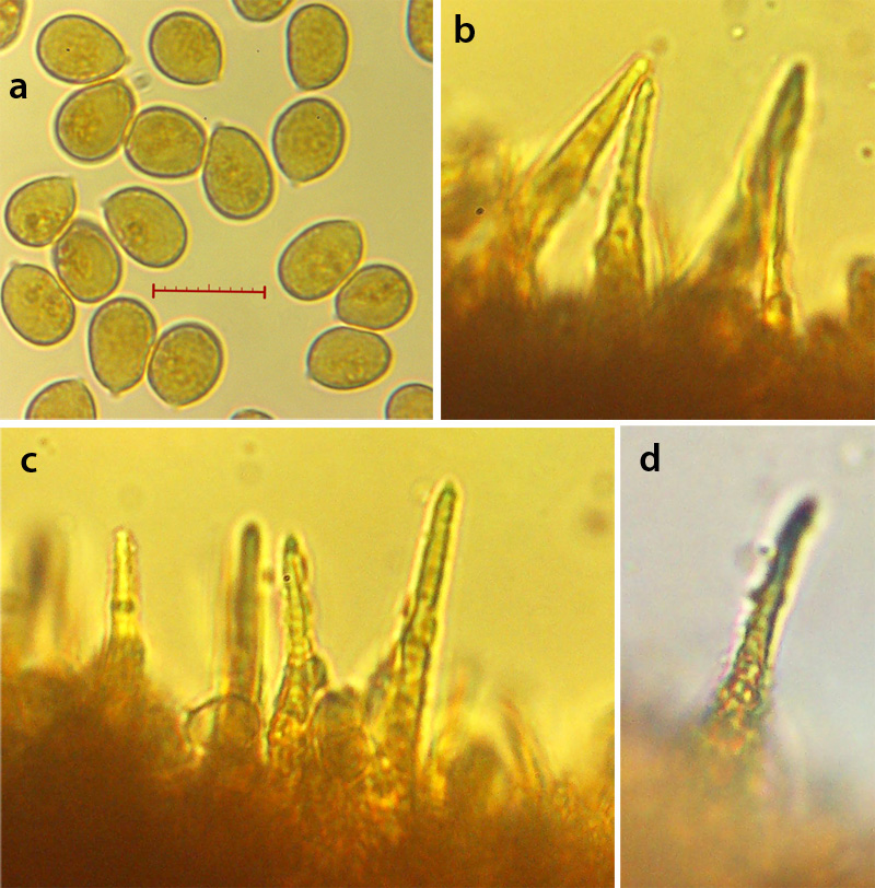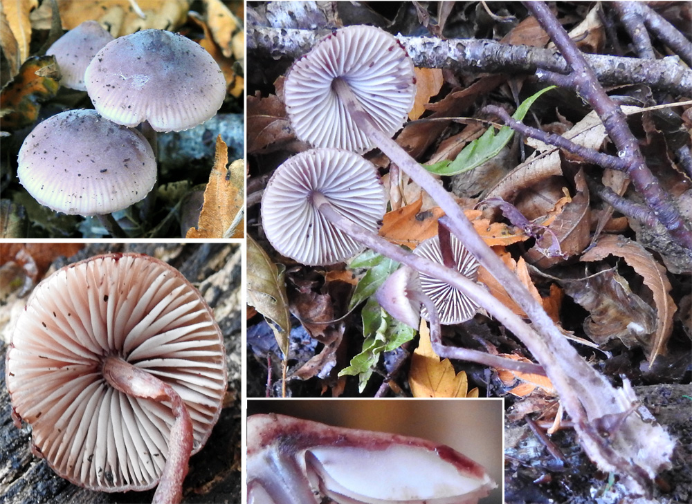 Small clustered fungus with purple-red colouration. Cap conical, to 25 cm diameter with darker apex and paler striated margin. Gills adnate-emarginate, off-white in colour; edge not coloured. Stem slender, smooth, hollow, purple-red in colour, with white hyphae at base; up to 70 mm long by less than 2 mm diameter. Cap flesh when cut exudes a dark blood-red liquid. Spore print white. Spores (above, a) rotundly oval with apiculus, smooth, amyloid; 7.7-10.0 x 5.6-6.0 um, mean = 8.4 x 5.8 um, N = 20. Cheilocystidia (b, c) lageniform with long narrow neck and pointed tip, common. Pleurocystidia (d) rare and similar to cheilocystidia.