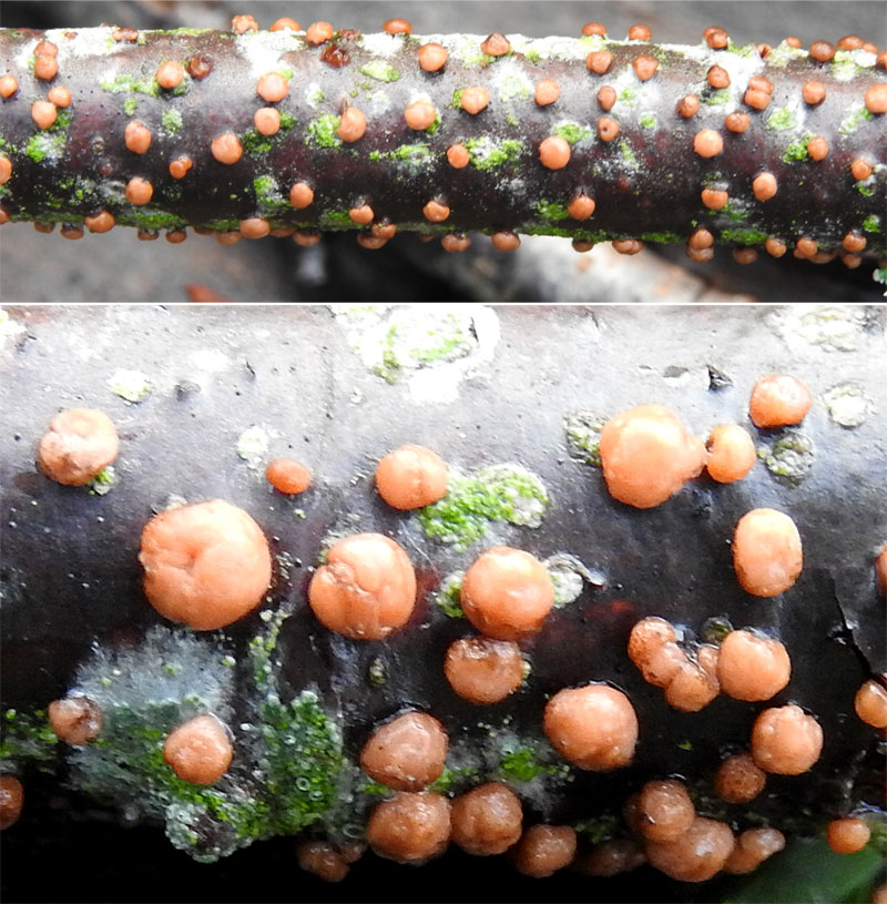 Occurs in two morphs. First as small 1-4 mm diameter structureless warts, coral pink to orange in colour; second as darker red-brown warts bearing multiple tiny globular spheres each with a terminal nipple.