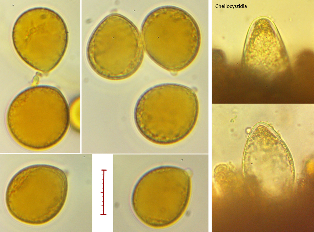 Snow-white to pale brown fungus up to 5 cm in diameter. Cap smoothly domed, with slimy, glossy surface. Gills adnate, white in colour, unbranched. Stalk white with collar ring and bulbous base that roots into wood. Spore print white. Spores large, spherical and smooth with apendiculus; 13.8-15.0 x 11.8-12.8 um (mean = 14.3 x 12.2 um N = 7); Qav.= 1.2. Cheilocystidia sparse; large and clavate.