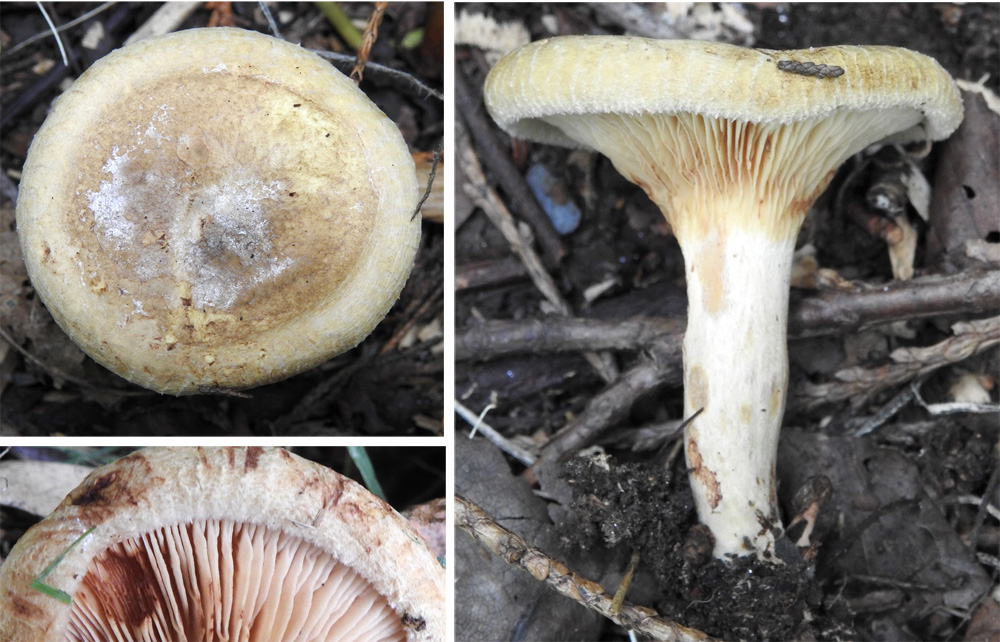 Cap to 90 mm, depressed centrally and with inrolled margin; that is ribbed and felted; brown mottled surface (patches of darker brown fibrous mesh over a more yellow-brown flesh) when damp. Gills dense, strongly decurrent; cream-coloured becoming brown where damaged or handled; branching common; lateral buttressing of the gills developed towards the edge. Stem stout (40 x 16 mm) tapering downwards; fibrillose; dry; hollow.