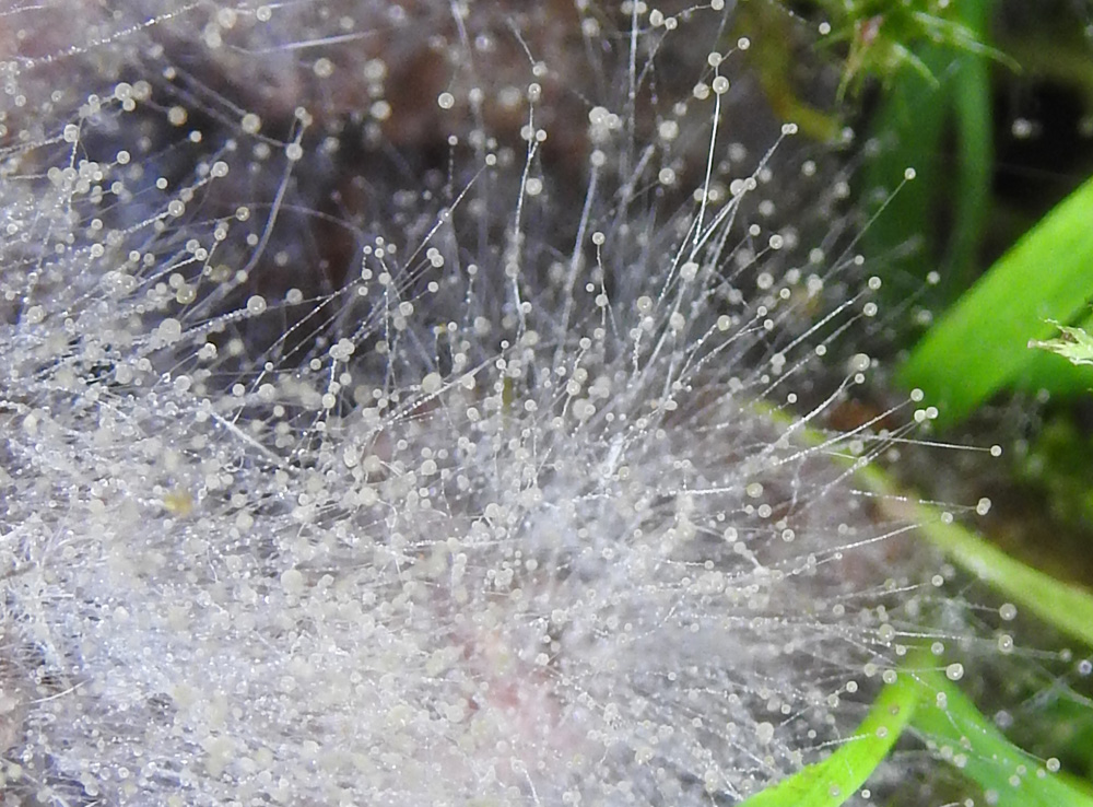 Small white pin-like hairs forming a fine fur-like coating. Sporangiophore circular, pale yellow to orange, held on a long unbranched hyphal stalk. Spores oval, smooth-walled and without oil inclusions; 7.9-9.7 x 4.2-5.3 um (mean = 8.6 x 4.9 um).