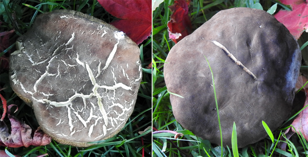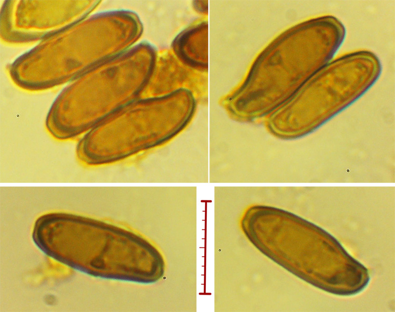 Cap bun-shaped; olive grey in colour with a cracked surface revealing white flesh. Lower surface sulphur yellow; gills decurrant; becoming blue when bruised. Stalk pale, slightly red near top but otherwise uncoloured; bulbous at base. When cut cap flesh uncoloured but stalk taking on a blood-red hue. Spores amyloid with distinctly truncated end; 13-14.8 x 4.8-5.8 um (mean = 13.9 x 5.2 um, N = 18). Usually attacked by fungus.