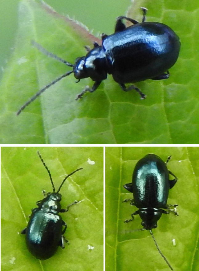 Tiny (3 mm) beetle with long unclubbed antennae and deep metallic blue colouration. Elytra lightly and irregularly dimpled (not in rows). Species identification requires dissection. Seen on guelder rose leaf.