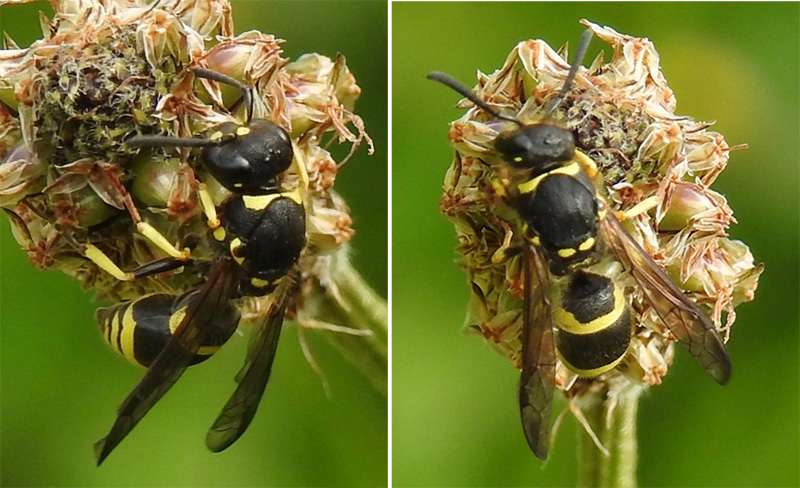Small black and yellow banded wasp - abdomen with distinctive banding pattern; yellow band on first dorsal plate projecting anteriorly on each side. Legs with black femur, yellow tibia and red tarsi. Single yellow spot on black face. Wings with two most distal cells smoked.