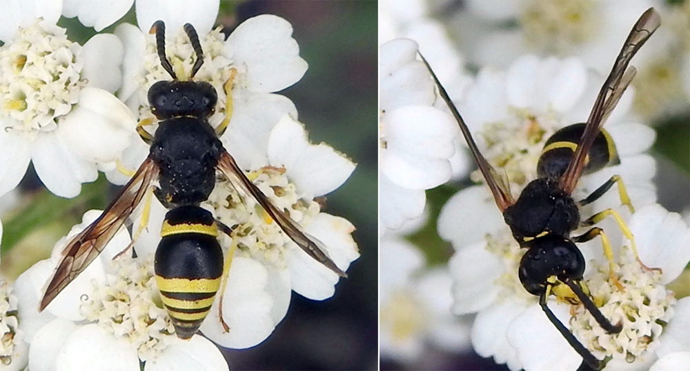 Small black and yellow banded wasp - abdomen with distinctive banding pattern; yellow band on first dorsal plate projecting anteriorly on each side. Yellow bars on thorax very small cf. A. gazella. Legs with black femur, yellow tibia and tarsi. Single yellow spot on black face; mandibles yellow. Underside of antennae yellow. Wings smoked.
