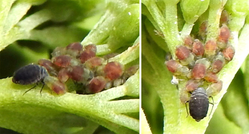 Black aphid; juvenile instars rosy. Anterior segments slightly dusted white. Antennae short and no visible siphuncules. In flower head of dogwood shrub (Cornus sanguinea) in greenhouse hedge, 5th May, 2025..