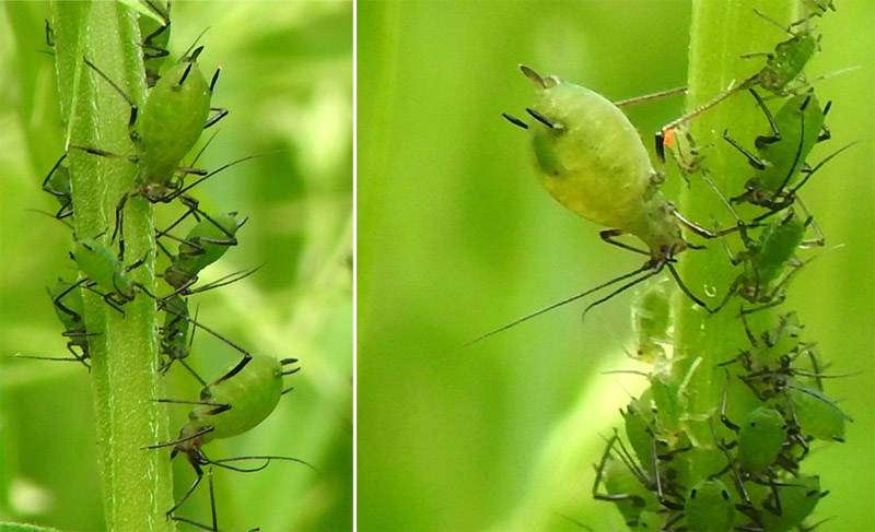 Large apple green to dark bluish green aphids. The largest individuals develop a black head and antennae, the latter being longer than the body. The body is green and globular with row of black sclerites are present in front of the siphunculi which are black and swollen in the middle, and about the same length as the cauda. The legs and cauda are also black. Present on tufted vetch (Vicia cracca) and meadow vetchling (Lanthyrus pratense) in wildflower border.