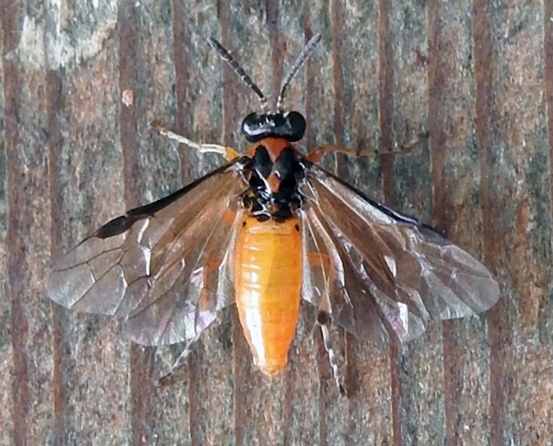 Distinctive, yellow-bodied sawfly with black head, red abdomen and red thorax with black 'shoulder pads'. Legs yellow but distal parts black and white banded. Wings with a strong black edging. Antennae segmented, not fused.