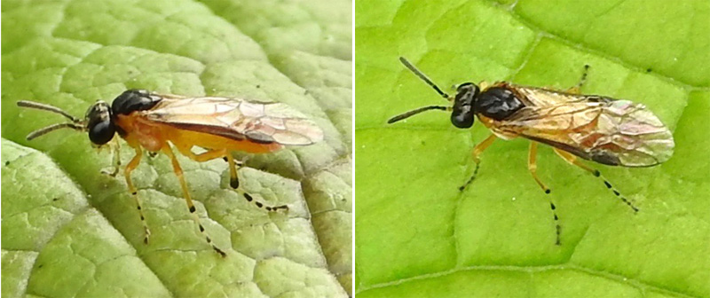 Small, yellow-bodied sawfly with black head, thorax and stout antenae. Posterior legs yellow with black distal ring to tibia and with tarsii strongly black and white banded. Anterior legs pale and tarsii yellow and hardly banded. Wings with a strong dark edging.