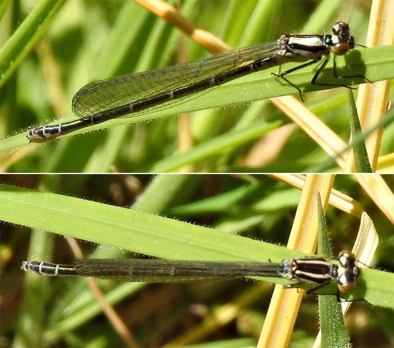 Black and pale yellow (female) damselfly with clear wings, two thin antehumeral stripes on the back of the thorax and coenagrion spur present (black line extending part way along the side of the thorax).
