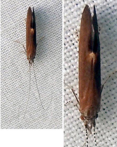 Large (ca. 1 cm) caddisfly with very long banded antennae and huge jointed palps held out either side of the head. Wings brown with pale yellow spot at tornus. Legs not spiney. Genital dissection required to confirm species identity. Attracted to white sheet and Moth lamp 5th July, 2024. Attracted to white sheet and Moth lamp 29th June, 2025.
