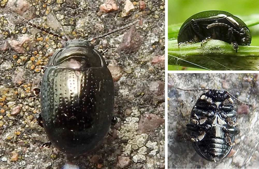 Rounded dark metallic blue-black beetle ca. 8 mm long. Antennae long and simple-ended. Pronotum smooth and with groove laterally. Elytra with rows of punctae. Several found om cow parsley flowers towards end of flowering season.