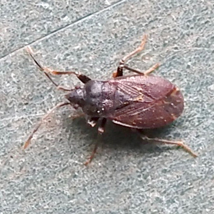 Small wide-bodied bug (3-4 mm) with black head and anterior part of pronotum black; posterior part of the pronotum and wing cases reddish-brown in colour. In wild flower border.