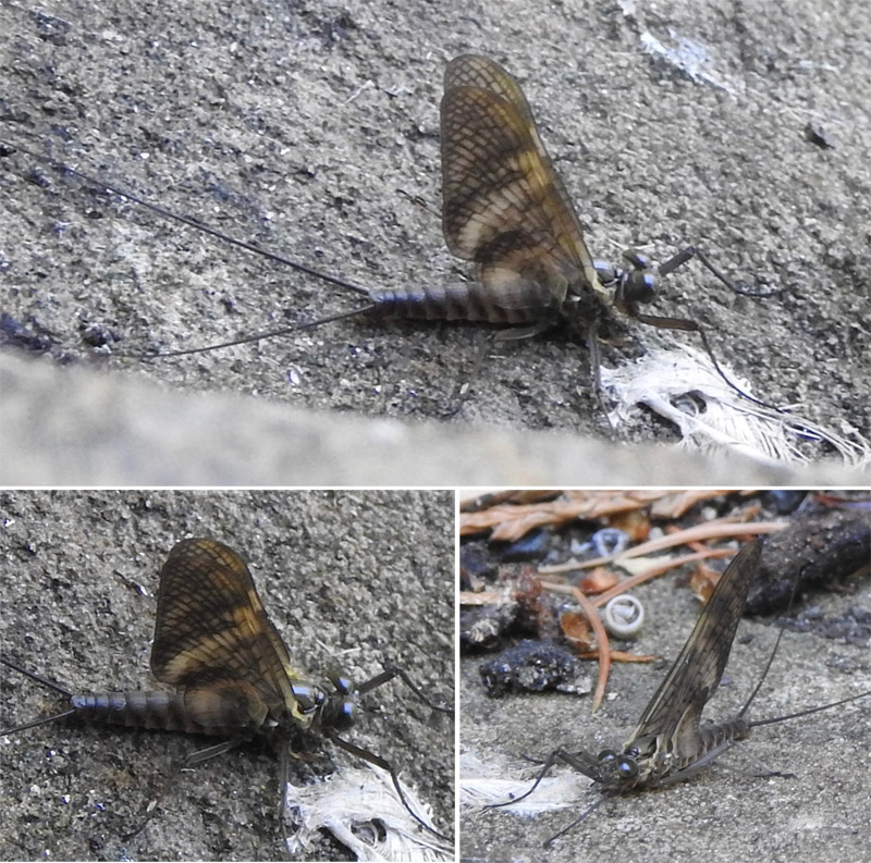 Large dark (black) mayfly with 2 tails and large hind wings; eyes rather large and close together. Wings dark with strong transverse banding. Abdomen dark grey with dark grey legs. Seen in garden during the day, 10th May 2025.