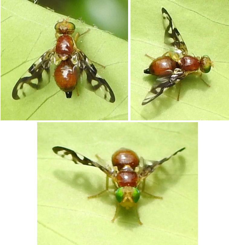 Small (3-5 mm) fly with strongly patterned black/translucent wings that are continuously waved slowly to signal to other flies. Thorax and abdomen red; abdomen ending in a black point. Eyes green. On mixed native tree hedge by vegetable garden.