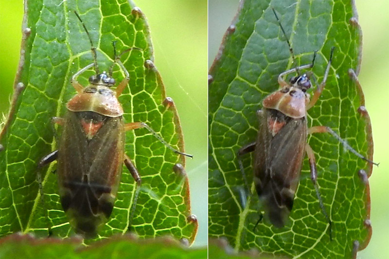 Dark bug, ca. 6 mm in length with distinctive black and white patterning. Back legs black, mid and fore legs pale brown. Found on nettles under oak tree and in adjacent hedge. Male above (with black and white thorax); female below.