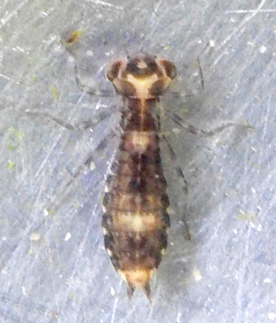 large dragonfly nymph exuvium with pointed tip to abdomen. In pond 12th July, 2024. Small nymphs seen in water 12th June, 2025.