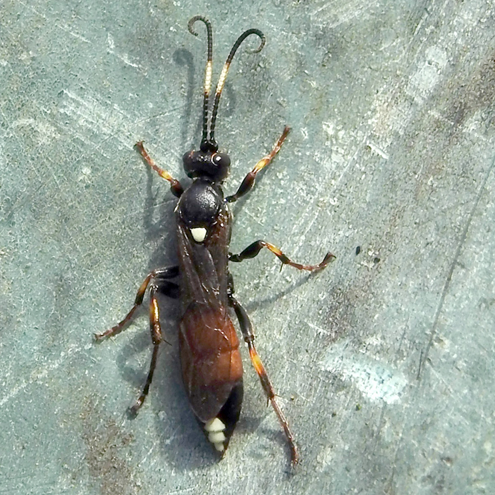 Large ichneumon wasp (ca. 12 mm). Antennae black with broad white band mid-length, head and thorax; Scutellum white; abdomen black with first two segments orange and with three white dorsal spots at posterior (female only). Femurs black; mid and posterior tibia with orange upper part and black distal part. In wild flower border 16th September, 2025. Species identification tentative - but colour banding of legs,specifically the dark tarsii of mid and rear legs suggests suspiciosus rather than the very similar stramentarius.