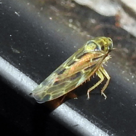 Yellow-green froghopper, ca. 6 mm in length, with orange sheen and large cell patterning. Posterior part of scutellum with yellow face flanked by black triangles; anterio part of scutellum with yellow T.