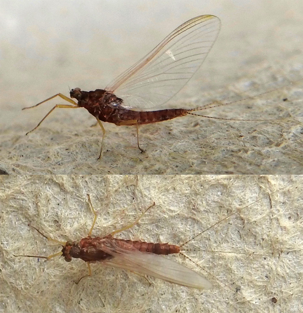 Dark bodied mayfly with three tails and large underwings. Wings clear without markings. Abdomen segments an rich brown colour. Attracted to light trap 20th July, 2024. Caught in light trap 20th June, and 25th July, 2025.