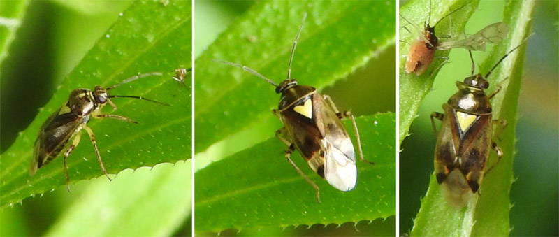 Small bug (5 mm) with obvious yellow 'heart' on pronotum and a pair of pale bars towards the posterior of the elytra. Legs with brown speckled femera. Firm species identification requires microscope work. Found on nettle and sticky willy leaves near pond rockery.