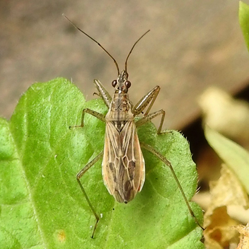 Small bug with wide abdomen and pale, lighty patterned wings that reach almost to the end of the body; speckled legs. Found in wildflower border in late August - early September.