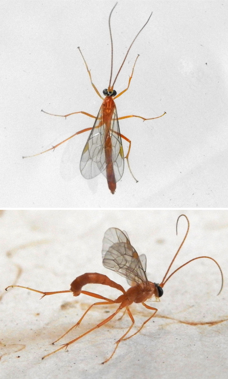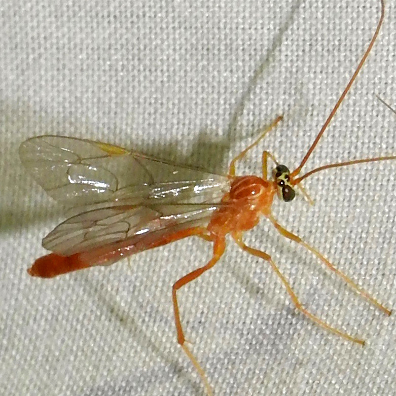 Small pale orange ichnuemon with large black eyes and three discrete black ocelli separated by yellow surrounds. Antennae orange, darkening slightly to tip. Thorax with two thin longitudinal yellow bars. Wing with yellow-orange stigmata; elongate discosubmarginal cell, small incompletely close triangular areolet, no 1m-cu developed, and 2 bullae on 2m-cu. Short straight ovipositer. Attracted to light trap 18th June, 2022 (upper); 16th August, 2023 (mid); 23rd August, 2024 (lower - identified by NHM scientists as part of nocturnal ichneumon project 2024).